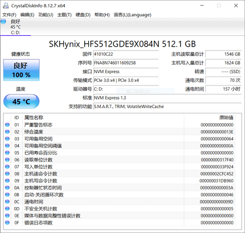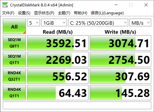 硬盘SK海力士512GB固态,M.2 NVMe接口,使用CrystalDiskMark测试,顺序读取速度为3592MB/s的读取,写入速度为3074MB/s,4K随机读取速度为64MB/s,写入速度145MB/s。