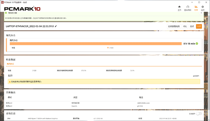 联想拯救者R7000P 2021内置了80Whr电池,我们使用PCMARK 10里的现代办公模式进行测试。测试时的电池电量为97%,调整联想电脑管家里的散热模式为安静模式,显卡为混合模式,屏幕亮度50%,保持WiFi和蓝牙、位置开启状态,最终获得超过8小时的续航,此时电池电量还剩余5%,可见,这款搭载了双A平台的联想拯救者R7000P 2021笔记本在续航时间上的表现相当优秀。