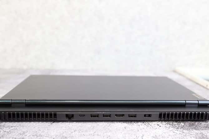 联想拯救者R7000P 2021的接口分布在机身后侧、左侧、右侧,能够满足当前常用的多种外设连接。机身后侧左右两端是后出风口,接口位于中间,除了电源输入接口,还包括1个RJ45有线网络接口,1个USB-C 3.2 Gen 2 (DisplayPort™ 1.4 及充电)接口,3个USB-A 3.2 Gen 1接口,1个HDMI 2.1接口。