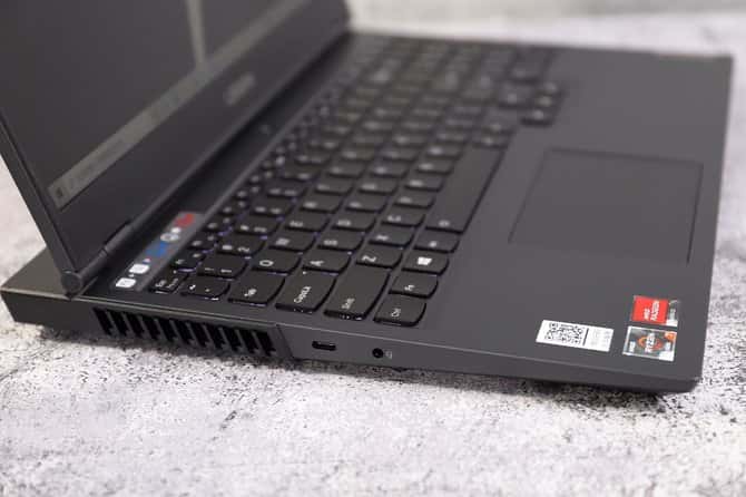 机身左侧靠后的位置是出风口,同时还提供了1个USB-C 3.2 Gen 2 (DisplayPort™ 1.4)接口,1个3.5mm音频接口。值得一提的是,这款笔记本还内置2×2W大功率扬声器,分别位于机身底部的两侧,由于支持的Nahimic 音效,玩家在游戏时具有身临其境的感受。