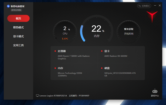 联想拯救者R7000P 2021还内置了联想电脑管家,在这里你可以随时查看笔记本当前的CPU占用和温度,内存占用等信息。