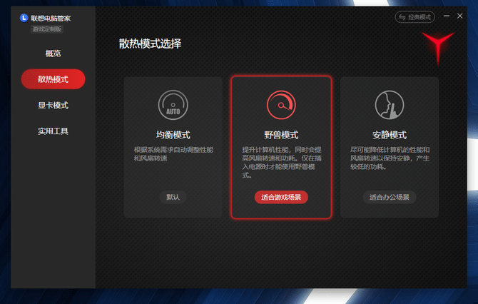 在散热模式里,你可以根据当前使用的状况设置为均衡、野兽、安静三种模式,如果是在游戏场景,设置为野兽模式,就可以获得更强的性能,以及更高的风扇转速。