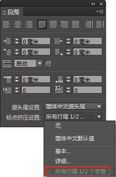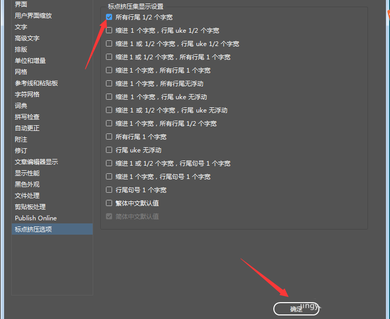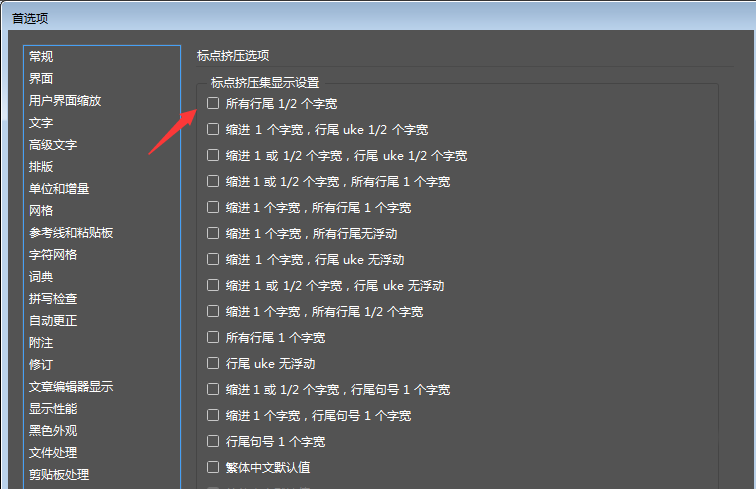 我把这段文本的标点挤压设置修改成别的选项或者直接把它删掉之后,首选项中的标点挤压选项就可以勾选「所有行尾 1/2 个字符」了。